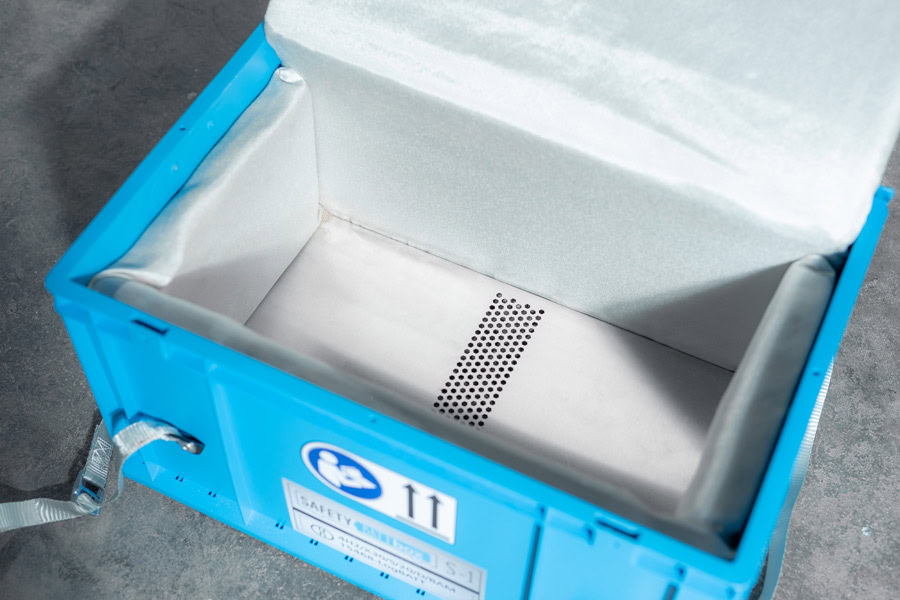 We developed this box for the storage and transport of defective or damaged lithium-ion batteries. It has been tested and approved to ADR 2025 P911.
